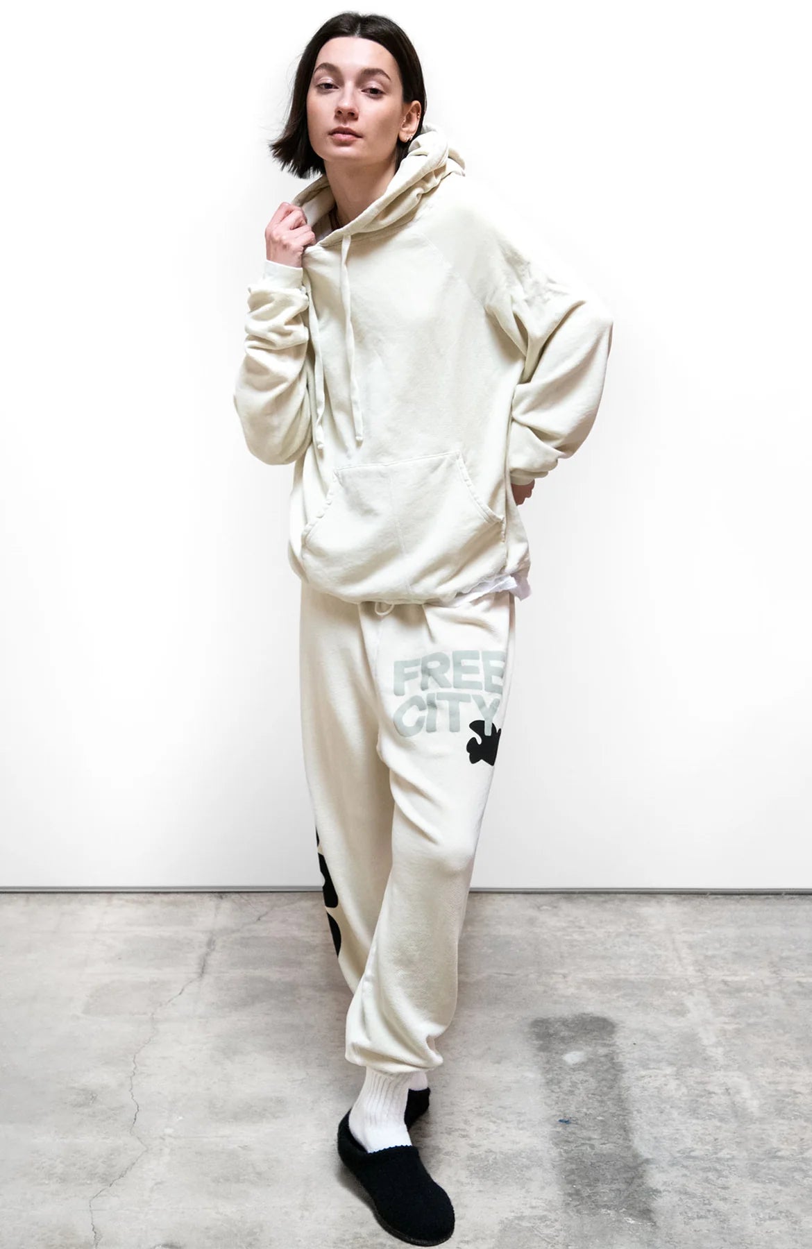 NEW unisex SUPERYUMM OG FREECITYLETSGO sweatpant in bones with classic “FREECITYLARGE” print in gray and black "FREECITYDOVE," black "LETSGO" print down the right leg, covered elastic waist with pull drawstring, generous oversized fit with supersoft hand-feel