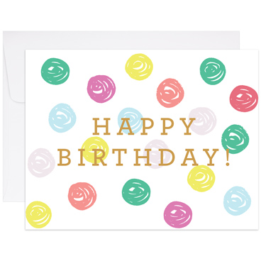 Happy Birthday Dots is hand illustrated, digitally printed + gold foil pressed, printed with lots of care on natural white cover stock. Blank interior + matching envelope. Individually packaged. A2 (4.25 x 5.5)
