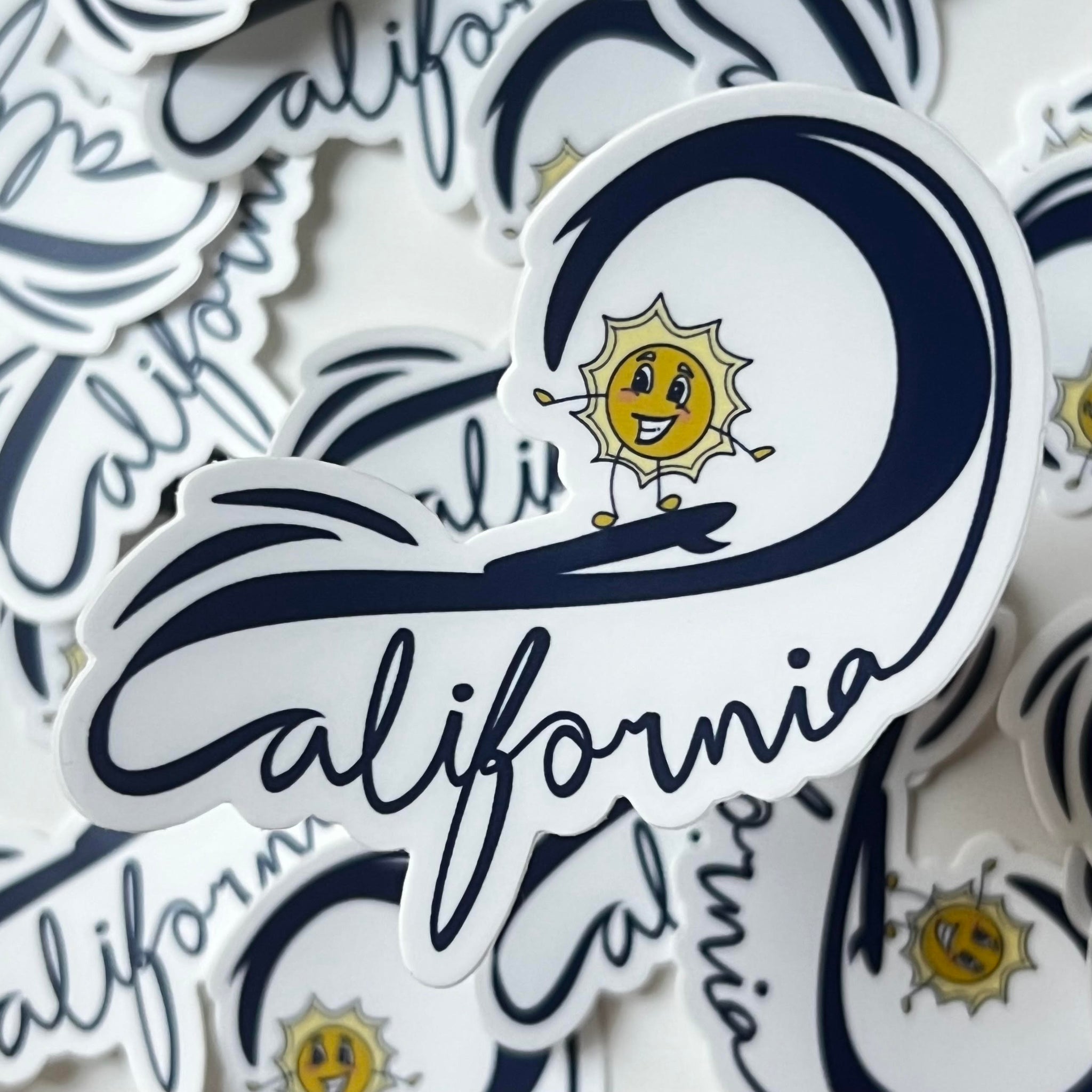 This colorful and durable sticker, featuring fun in the sun with a California surfer, makes the perfect adornment for water bottles, laptops, notebooks and more. • Matte Laminated Polypropylene sticker • Approximately 3.6″ x 2.8″