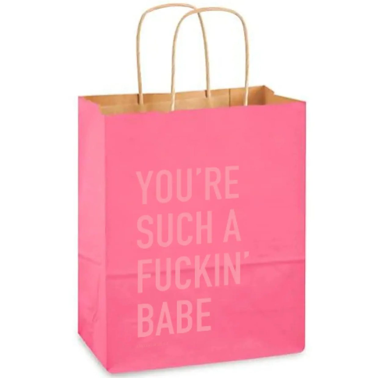Hand stamped paper gift bag with twisted paper handles. Dimensions: 8" wide, 10" tall, 4" deep