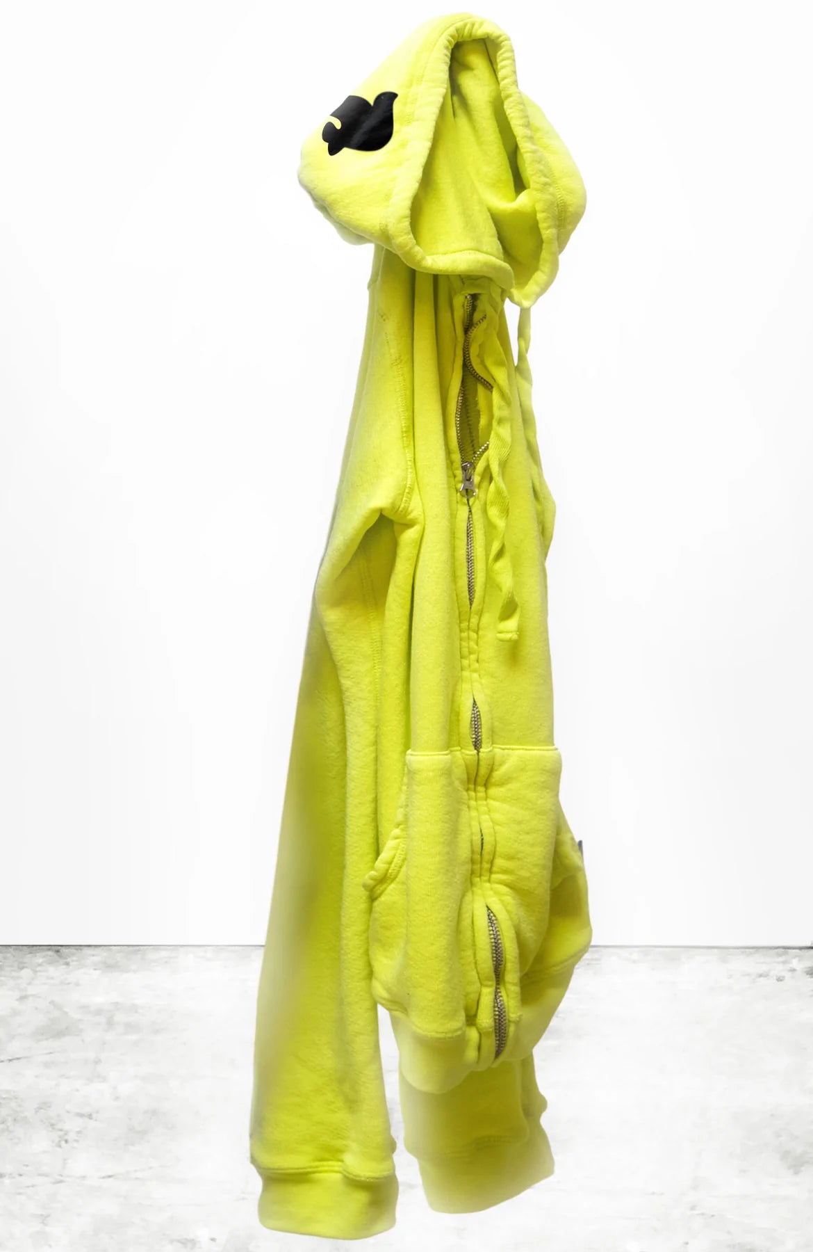 Unisex SUPERFLUFF LUX zip hoodie in glowlight yellow with classic “FREECITYDOVE” print on hood.