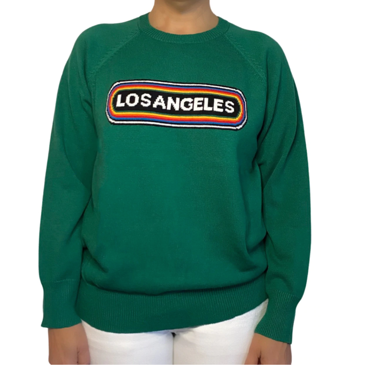 Super soft, raglan sleeve, fully-fashioned crewneck sweater with 'Los Angeles' intarsia.