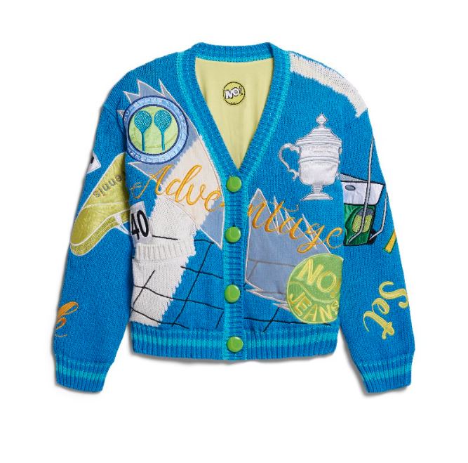 In a rich medley of blues reminiscent of the courts, this tennis-themed V-neck cardigan is adorned with embroidered tennis motifs. Sporting contrasting stripes, the cardigan fastens with vibrant tennis ball-inspired buttons, so you can keep stylish on and off the court.