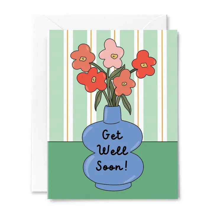 Sending healing thoughts and get well wishes to your loved one. Our Get Well Soon card features a vibrant illustration of colorful flowers, symbolizing hope and renewal. The pink text at the top conveys a heartfelt message, reminding your loved one that you're there for them during this time of need. • Size: A2 (4.25 x 5.5 inch) • Comes with matching envelope • Printed in the USA on 110 lb recycled card stock • Blank inside • Designed by Illustrating Amy