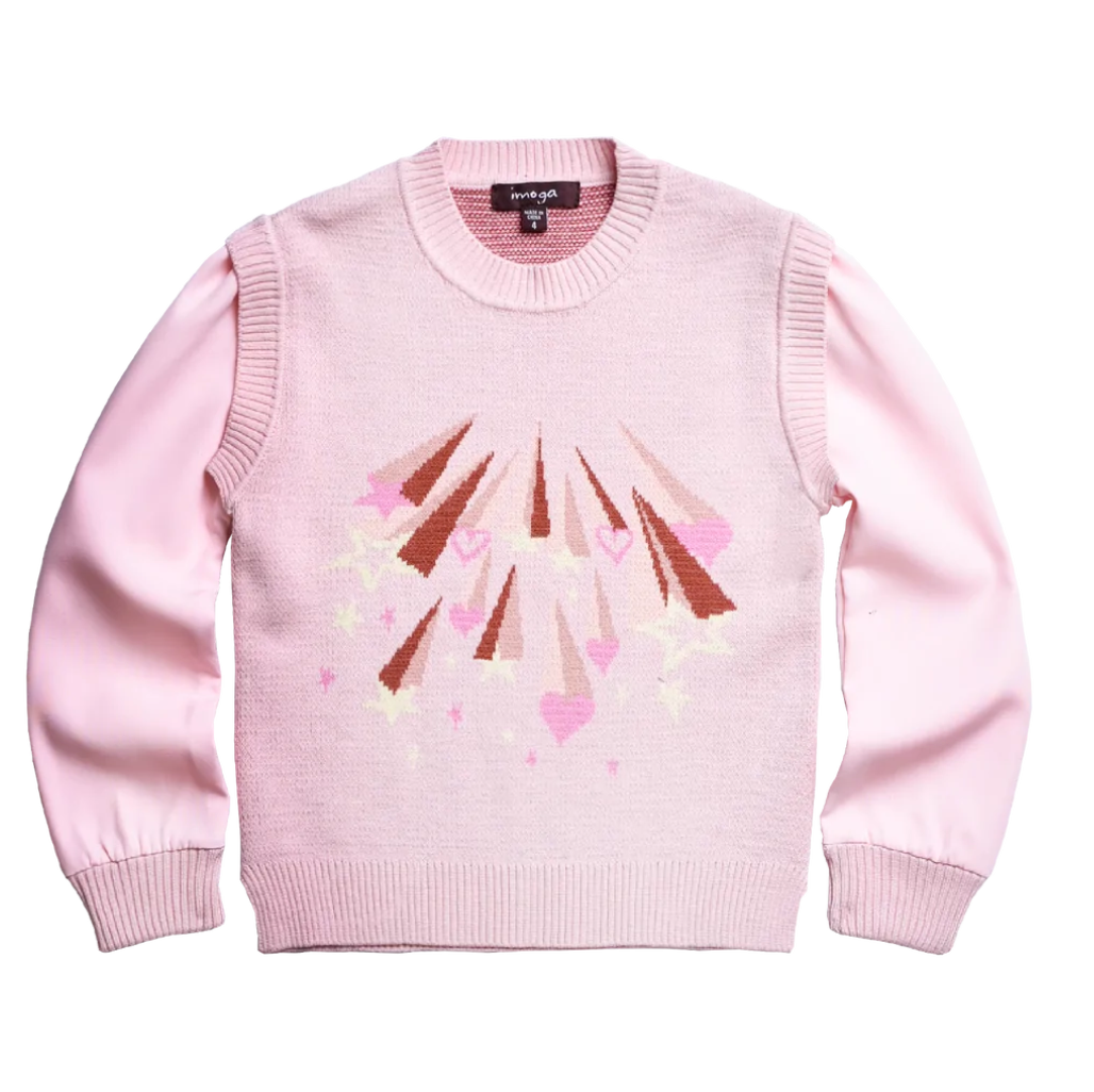 Lovely micro-knit crewneck girls sweater vest with attached woven sleeves and knitted ribbed comfortable cuffs. Featuring colorful intarsia pattern. Pairs well with skirts and leggings.