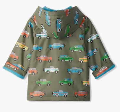 Soft terry lining furthers the coziness of an ORV–print raincoat that'll brighten baby's rainy-day style.